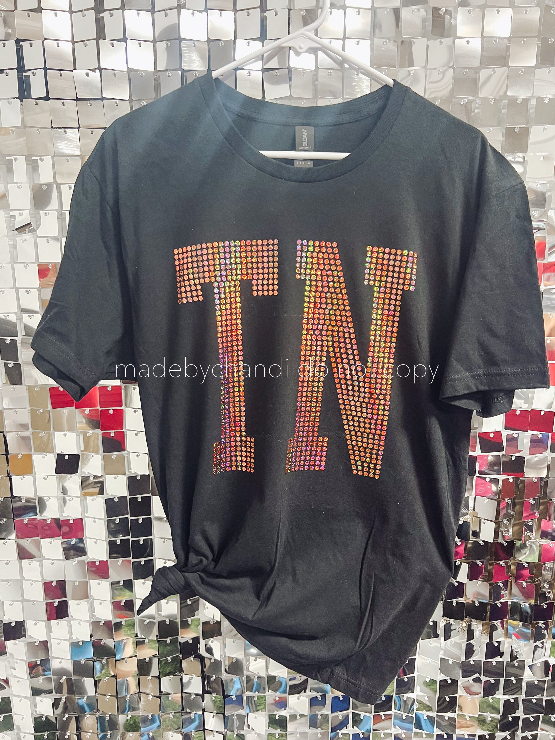 Black Gildan Softstyle Unisex tee with orange disco dots. Size up for an oversized fit.