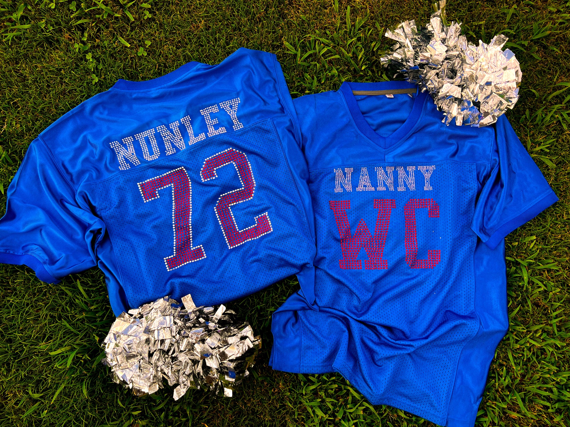 Custom rhinestone jersey with choice of text! Please leave in notes colors, jsersey color, and what text on front and back should be. Price includes one word on front and name/number on back. Keep in mind these are a boxy fit (actual jerseys) but I wouldn't not size down, a large fit actually looks better and makes your design more visibile.