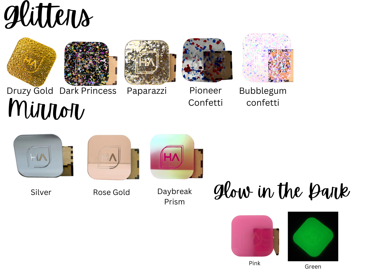 All Acrylic. Great for photos and other social media content. Please add in text box the handle or name, background and font color choice as well as font. The size is around 6 inches wide. Height depends on font used. Glitters will only be used as background colors (they don't not work well as fonts)
